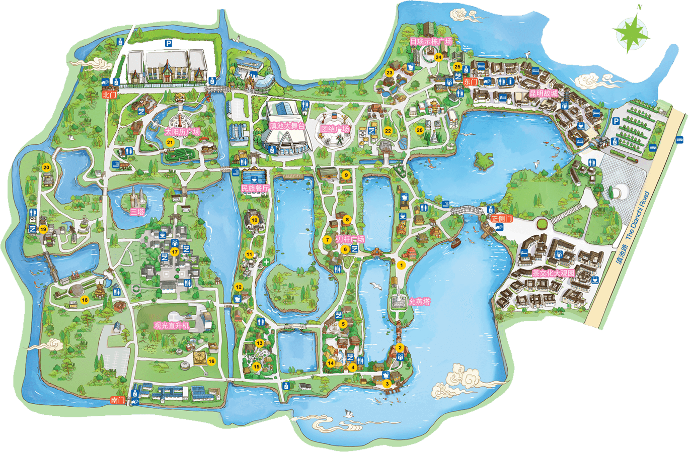 傣族人口約107萬人,主要分布在云南的德宏傣族景頗族自治州、西雙版納傣族自治州及瀾滄江流域的河谷壩子區(qū)域。傣族寨是進入民族村的第一個村寨,占地面積27畝,三面環(huán)水,綠樹掩映。一幢幢“干欄式”傣家竹樓,通過蜿延的紅砂石小徑聯(lián)向肅穆的緬寺。巍峨壯觀的白塔,精巧玲瓏的風(fēng)雨橋,以及風(fēng)雨亭、水井、鐘亭等建筑充滿著傣家的濃郁風(fēng)情,是傣寨真實的民間景觀再現(xiàn)。一年一度的“潑水節(jié)”期間,這里都有活潑歡快的“象腳鼓舞...
