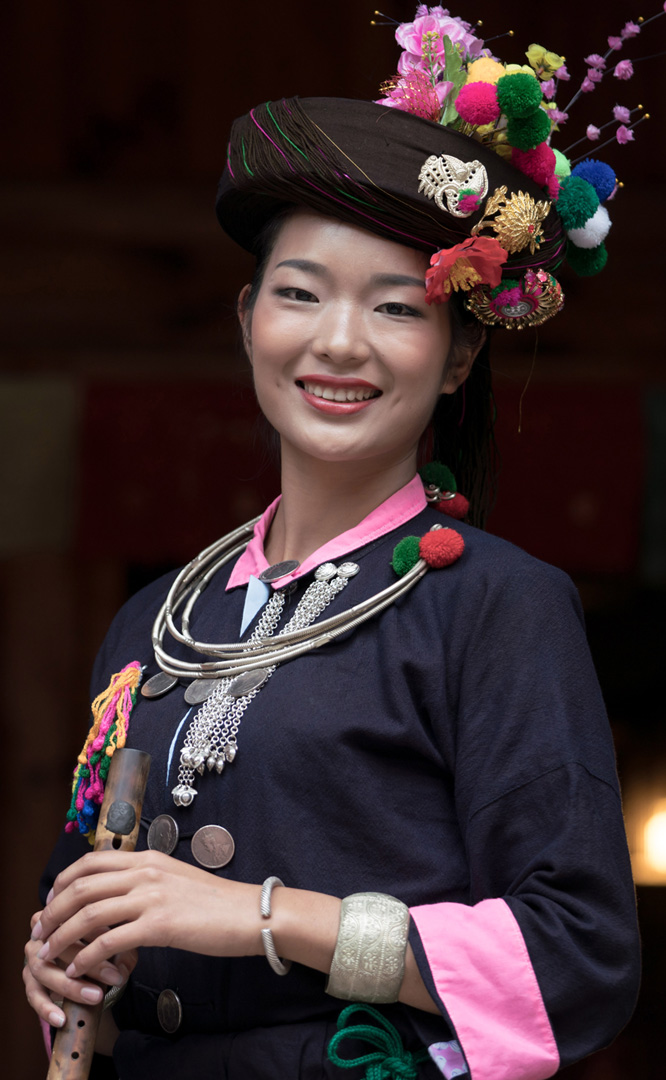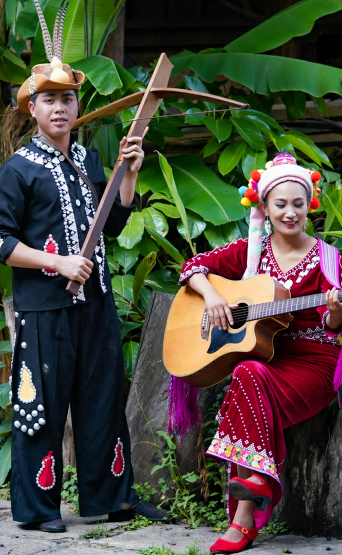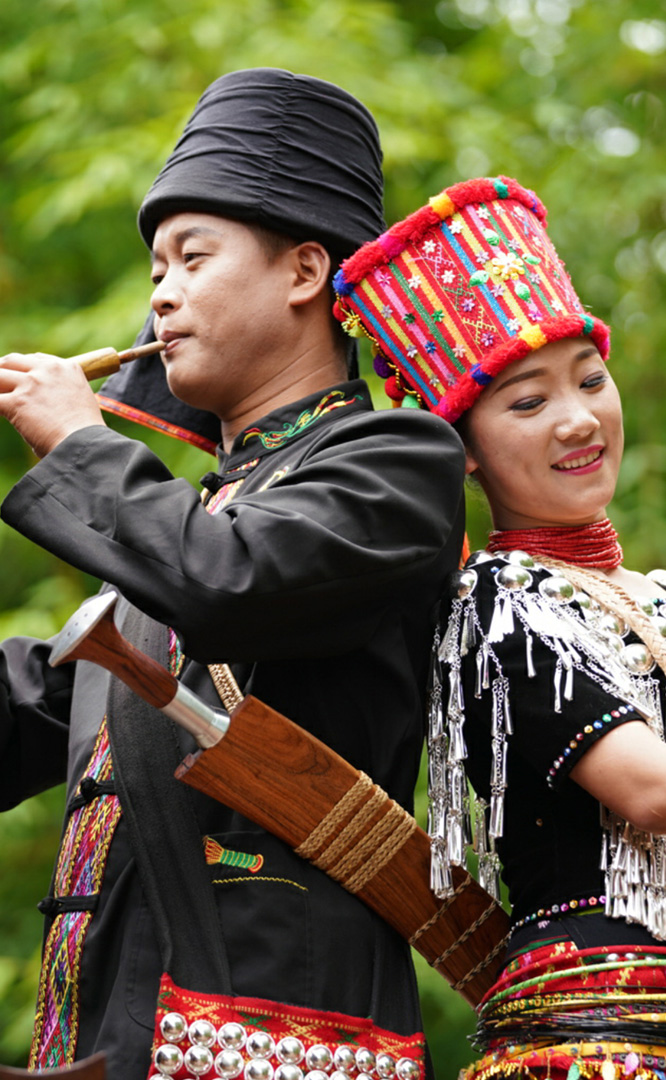 德昂族人口約1.7萬,主要分布在德宏州和保山市的潞西、梁河、瑞麗、隴川、隆陽等縣區(qū)。民居多為草排覆頂竹木結(jié)構(gòu)的干欄式建筑,眼前的德昂村建筑納入了能容納數(shù)十人居住的德昂大房子,氈帽頂?shù)男》孔樱€有頗具浪漫色彩的大公房、小公房……還建有“龍陽塔”標(biāo)志及佛教奘房、佛塔。德昂族民間普遍信奉南傳佛教,民俗活動與佛事活動關(guān)聯(lián)緊密。潑水節(jié)、開門節(jié)、關(guān)門節(jié)是重大節(jié)日。德昂族服飾色彩豐富,口頭文學(xué)特別是民歌創(chuàng)作活動...